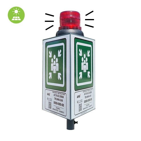 Güneş Enerjili İkazlı Acil Toplanma Alanı Tabelası Üç YönlüEmergency Assembly Area with Solar Beacon360 dereceden görünmektedir.Anlık ışık geçişlerinden etkilenmez ve çalışmaya devam eder.Optimize edilmiş Polikarbonat lensi sayesinde yüksek ışık yayımı yapar.UV ışınlarından etkilenmez.IP66 koruma sınıfında olup,dış ortama uygundur. Bilgi Levhaları, Nerede ve Hangi Alanlarda Kullanılır?⋙ Şehir içi toplanma alanlarında, hoteller, metro,⋙ Ücretli veya ücretsiz tüm otopark toplanma noktalarında⋙ Park alanı / yeri bulunan alanlarda, araç ve yayaları bilgilendirmek amacıyla ⋙ Geniş kullanım alanı: Yol kenarlarında, park alanlarında, sosyal alanlarda, güvenlik gerektiren her türlü alanda kullanılmaktadır.T.C. İÇİŞLERİ BAKANLIĞI Afet ve Acil Durum Yönetimi Başkanlığı yönetmeliğine uygun olarak hazırlanır.Direk hariçtir. 30x40cm gövdeLamba yüksekliği 14cm5cm boruya uygun